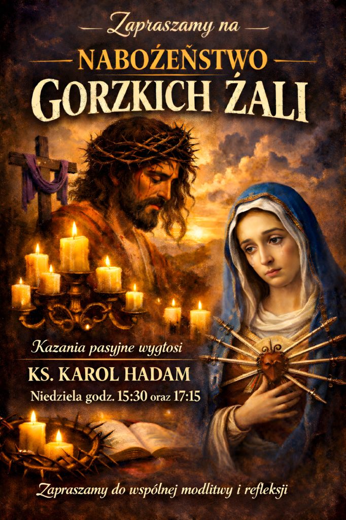 Serdecznie zapraszamy do udziału w nabożeństwie Gorzkich Żali, które jest szczególnym czasem modlitwy, refleksji i rozważania Męki Pańskiej. Nabożeństwo odprawiane będzie w każdą niedzielę Wielkiego Postu o godz. 15:30 oraz