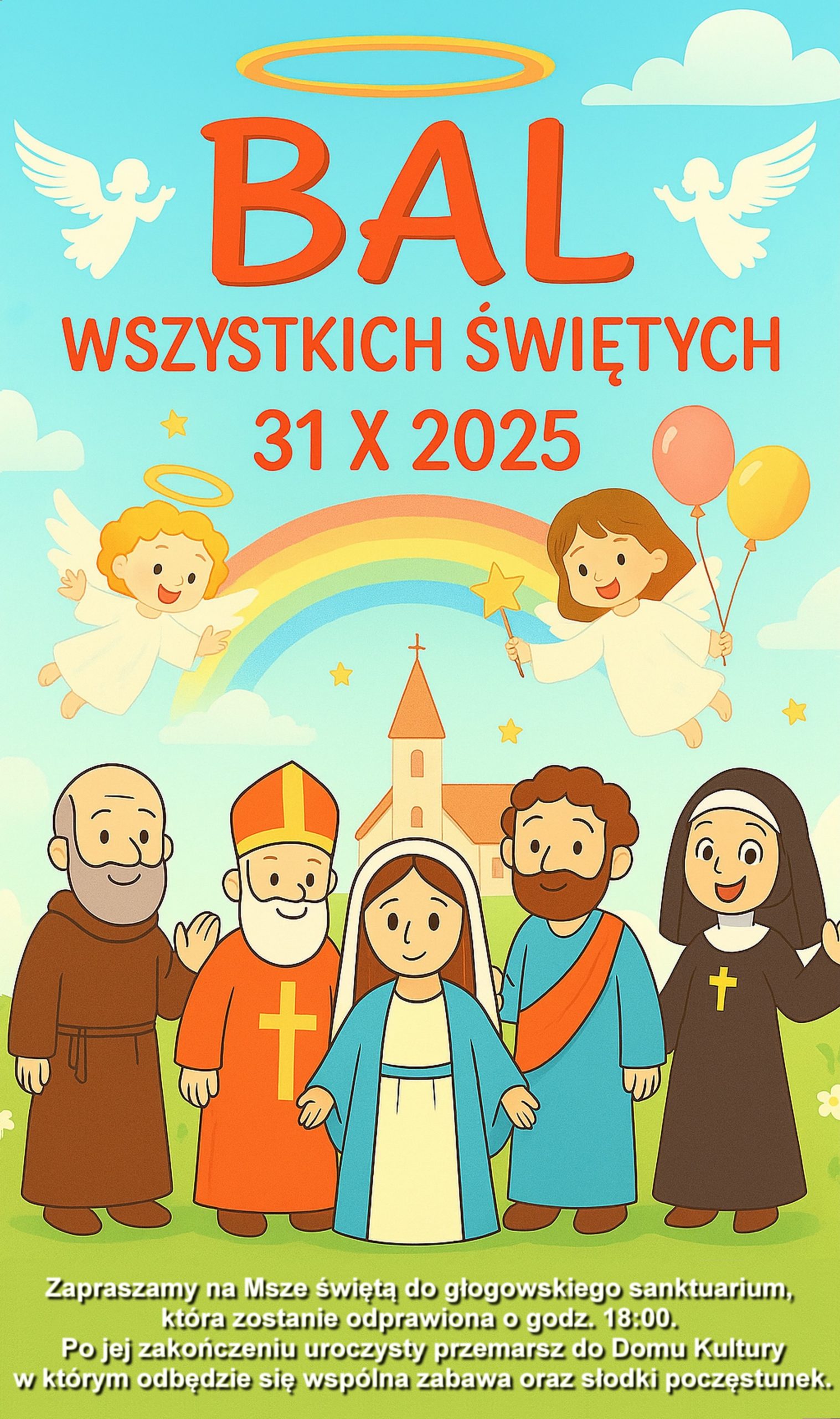 Duszpasterze i rodziny zaangażowane w Domowy Kościół zapraszają na bal Wszystkich świętych. W tym roku bal ten odbędzie się 31 października. Rozpoczniemy Mszą św. o godz. 18.00, następnie przejdziemy do Domu Kultury gdzie będziemy kontynuowali naszą zabawę. Zapraszamy, aby sprawić dzieciom i sobie frajdę i przebrać się za jednego z naszych świętych patronów.