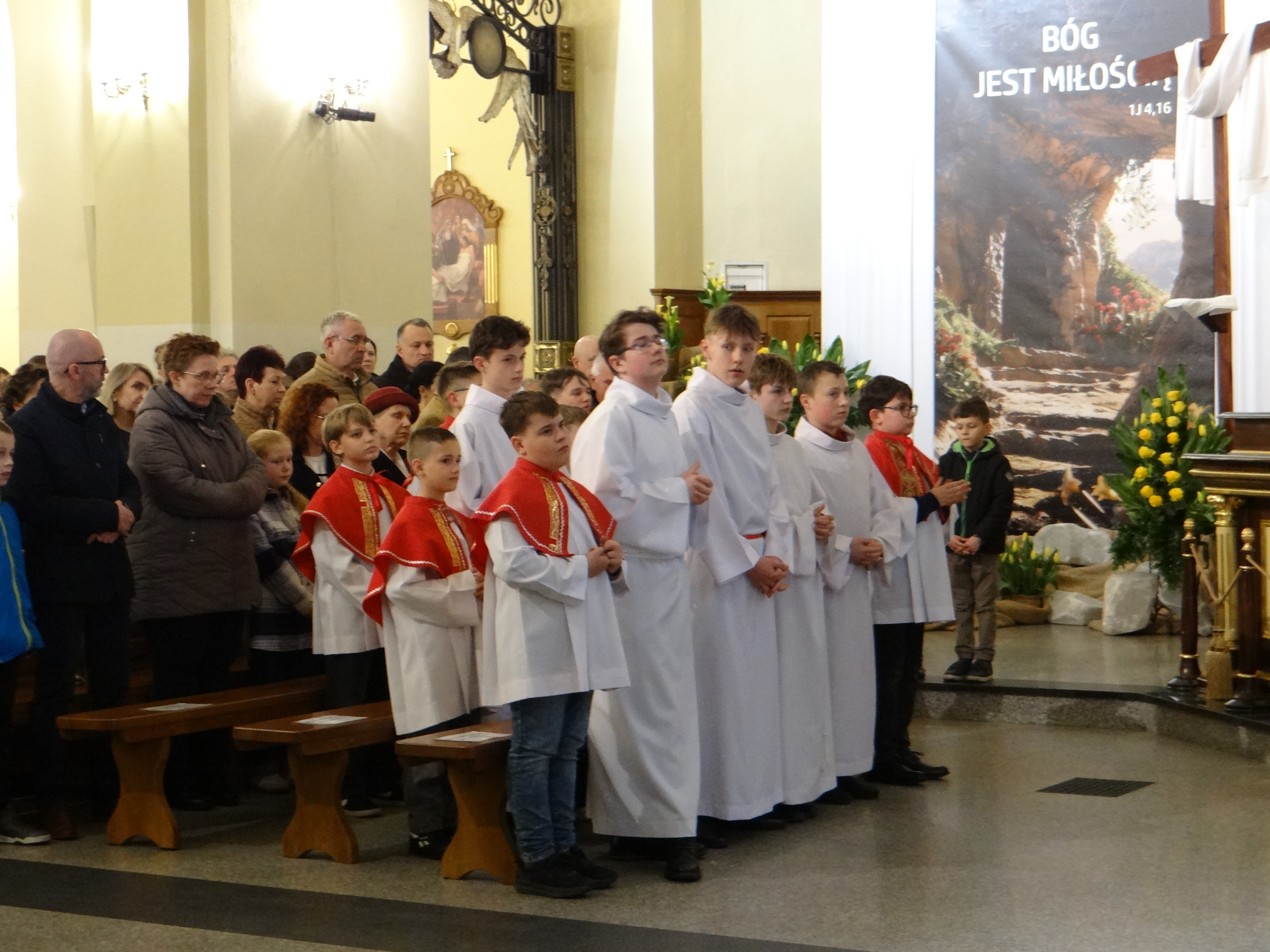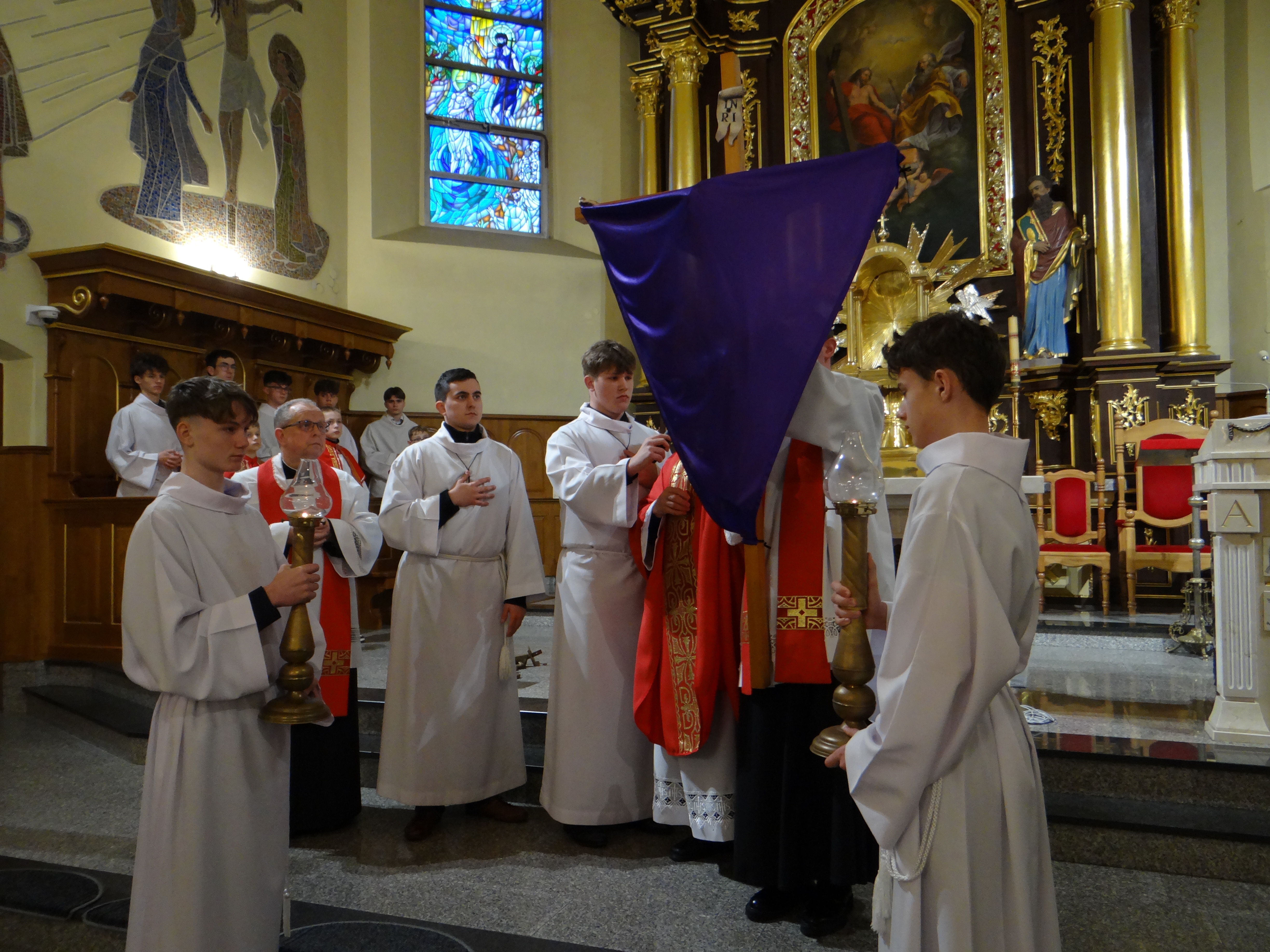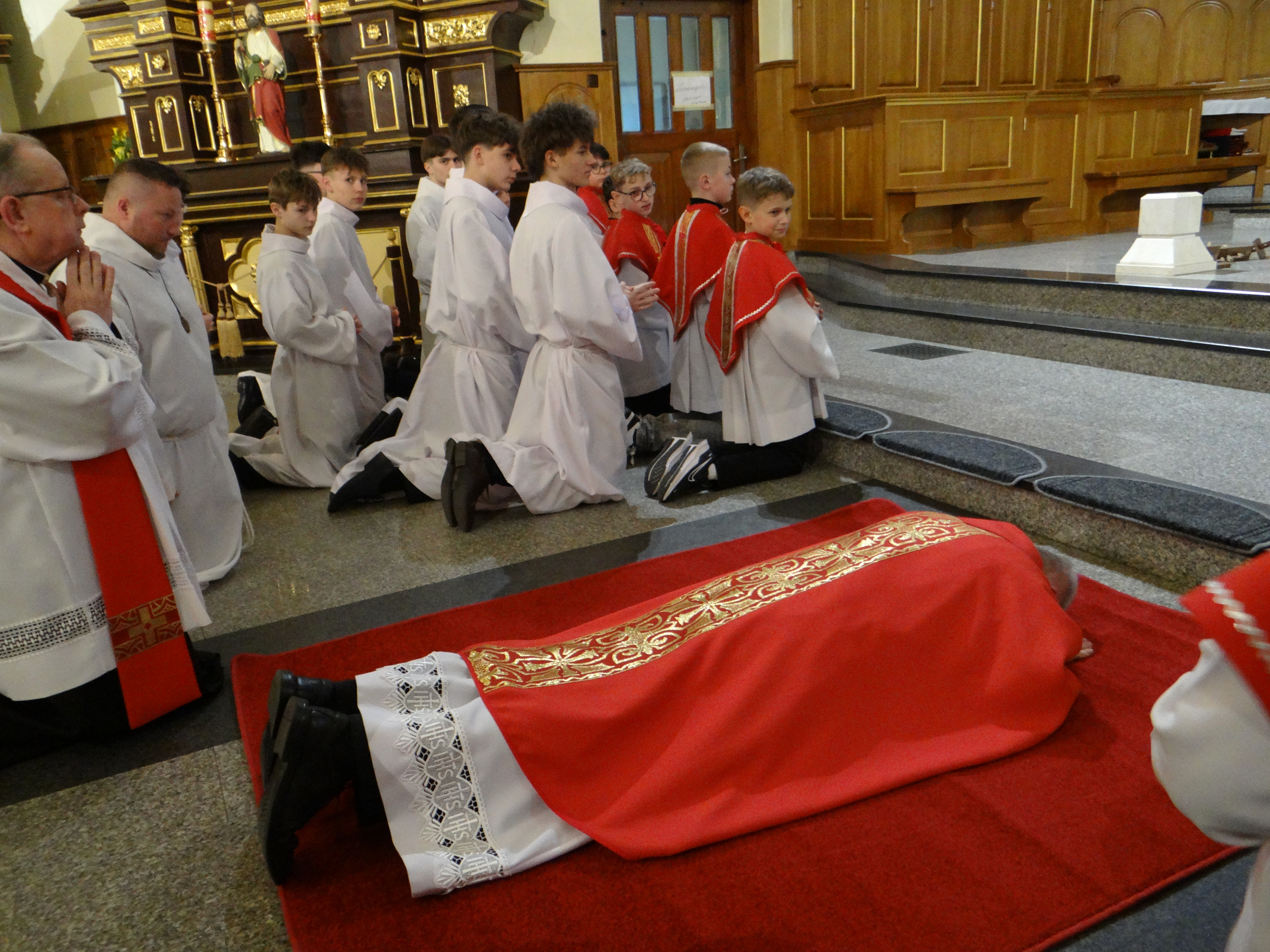 3 kwietnia, w Wielki Piątek o godz. 18:00, w naszej parafii przeżywaliśmy piękną i doniosłą Liturgię Męki Pańskiej. To wyjątkowe nabożeństwo, pełne skupienia i modlitwy, zgromadziło licznych wiernych pragnących wspólnie rozważać tajemnicę męki i śmierci Jezusa Chrystusa. Liturgia została podzielona na cztery części: liturgię słowa, adorację krzyża, Komunię Świętą oraz procesję do grobu Pańskiego. Każdy z tych elementów wprowadzał uczestników w coraz głębsze przeżywanie tajemnicy zbawienia, ukazując bezmiar miłości Boga do człowieka. Naszemu zgromadzeniu liturgicznemu przewodniczył Dziekan dekanatu Głogów Małopolski, ks. dr Stanisław Kamiński, który na co dzień posługuje jako proboszcz w parafii św. Józefa na Niwie. Homilię do zgromadzonych wygłosił wikariusz, ks. Karol Hadam, kierując do wiernych słowa zachęty do refleksji nad własnym życiem i wdzięczności za dar odkupienia. Po zakończonej liturgii wszyscy zebrani mieli możliwość osobistej modlitwy i adoracji krzyża oraz Najświętszego Sakramentu w grobie Pańskim aż do godz. 24:00. Ten czas ciszy i czuwania stał się dla wielu okazją do głębokiego spotkania z Chrystusem i powierzenia Mu swoich trosk oraz nadziei.