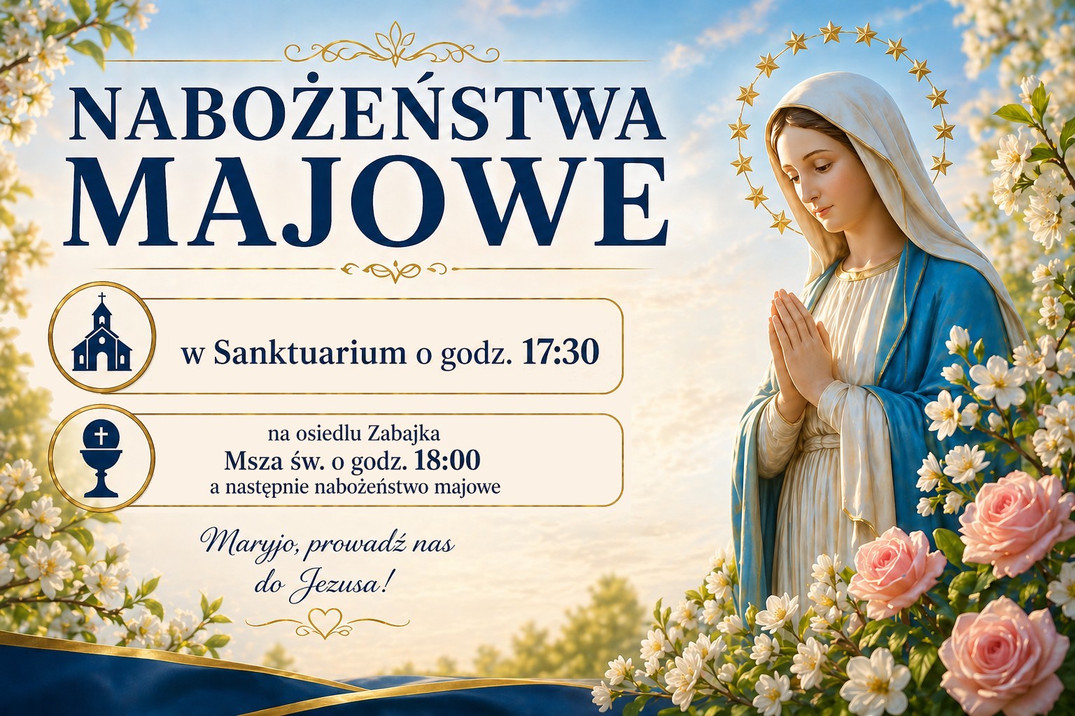 Drodzy Parafianie, Serdecznie zapraszamy do wspólnego przeżywania nabożeństw majowych – szczególnego czasu modlitwy i zawierzenia Matce Bożej. Maj to miesiąc, w którym w sposób wyjątkowy gromadzimy się, by oddać cześć Maryi, prosząc Ją o wstawiennictwo i prowadzenie naszych serc do Jezusa. Niech wspólna modlitwa Litanią Loretańską stanie się dla nas okazją do umocnienia wiary, odnalezienia pokoju oraz pogłębienia więzi z Bogiem i wspólnotą parafialną. Zapraszamy wszystkich – dzieci, młodzież, dorosłych i seniorów – abyśmy razem tworzyli atmosferę modlitwy, jedności i nadziei. Maryjo, prowadź nas do Jezusa!