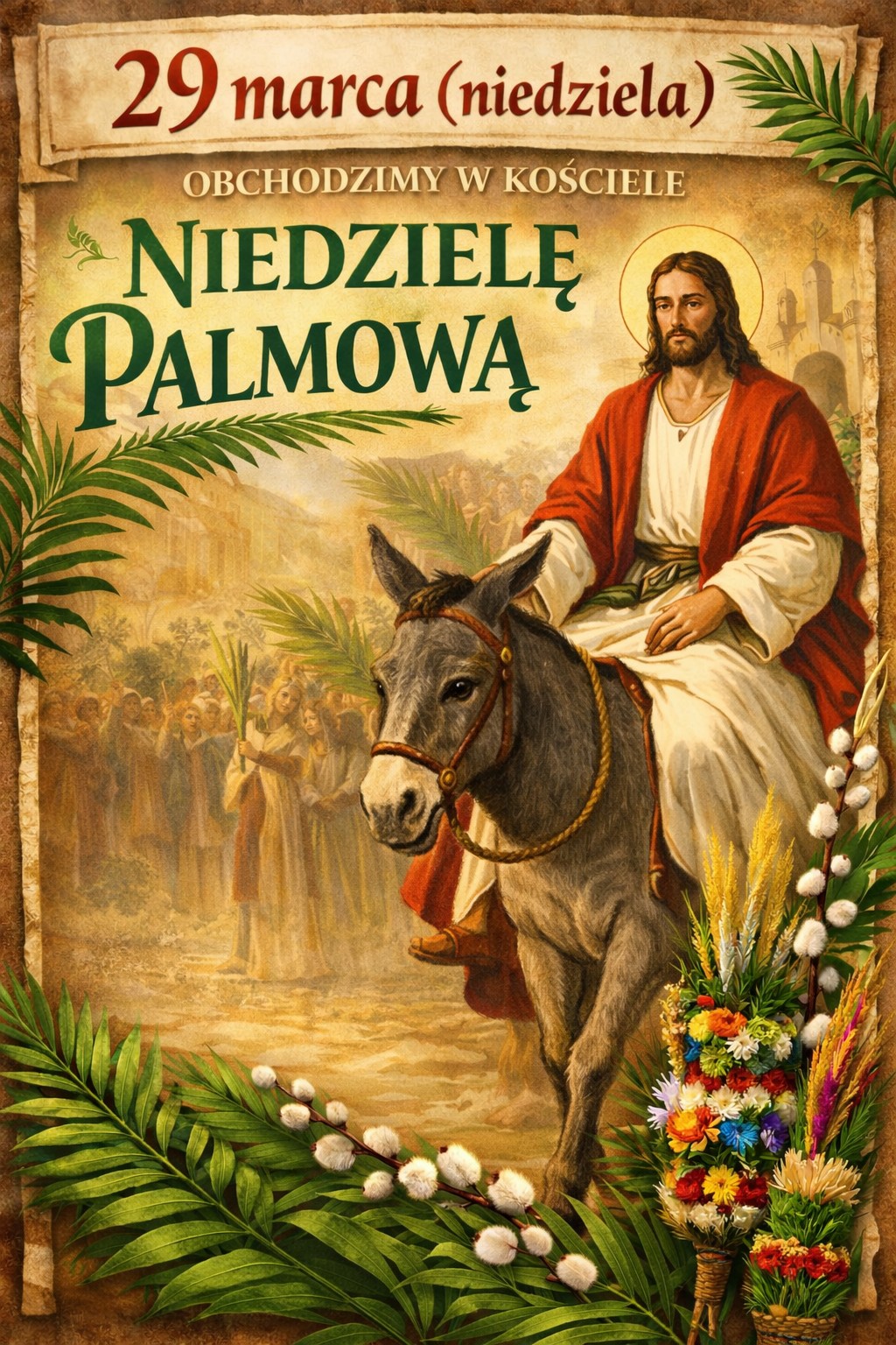 W przyszłą niedzielę – niedziela Palmowa czyli Męki Pańskiej. Na wszystkich Mszach Św. poświęcenie Palm. Na sumie o godz. 11:00 będzie dodatkowo procesja z palmami. Prosimy, aby zgromadzić się z palmami przed świątynią, tam nastąpi najpierw odczytanie Ewangelii o wjeździe Jezusa do Jerozolimy, poświęcenie palm i procesja z palmami do świątyni.