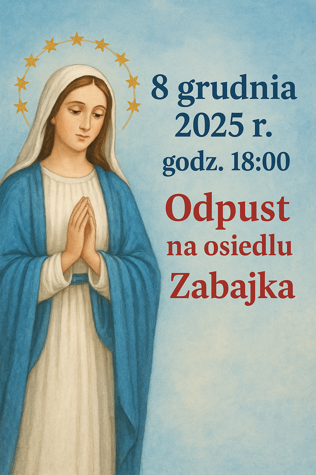 W poniedziałek 8 grudnia Uroczystość Niepokalanego Poczęcia NMP. Msze św. w kościele farnym o godz. 6.30, 8.00, 12.30, 16.00 i 18.00. W tym dniu adoracja Najświętszego Sakramentu rozpocznie się po Mszy o godz. 8.00. Wszystkich czcicieli Matki Bożej zapraszamy na „Godzinę Łaski” od 12.00-12.30. Na os. Zabajka Uroczystość tę będziemy obchodzić jako odpust. Msza św. o godz. 18.00.