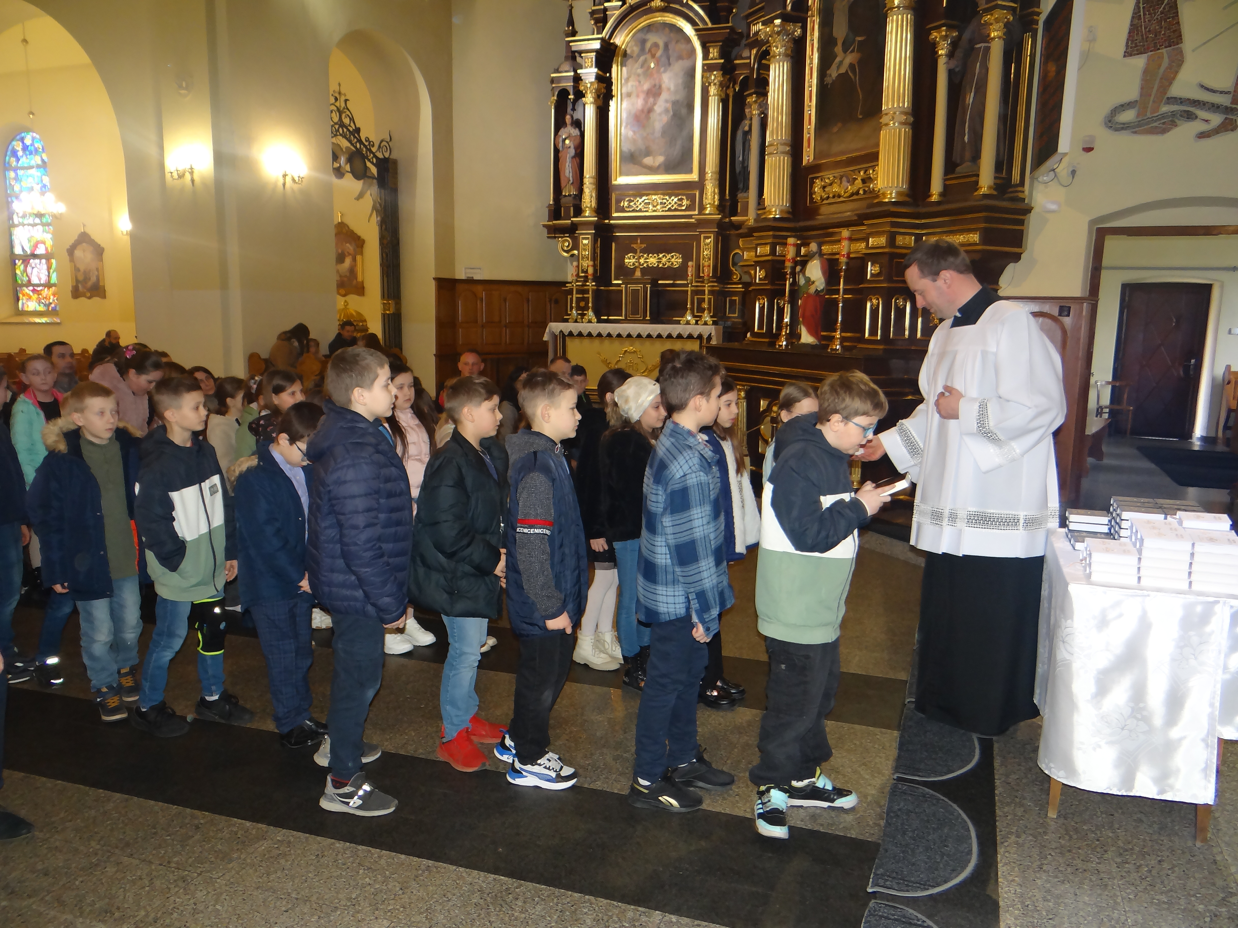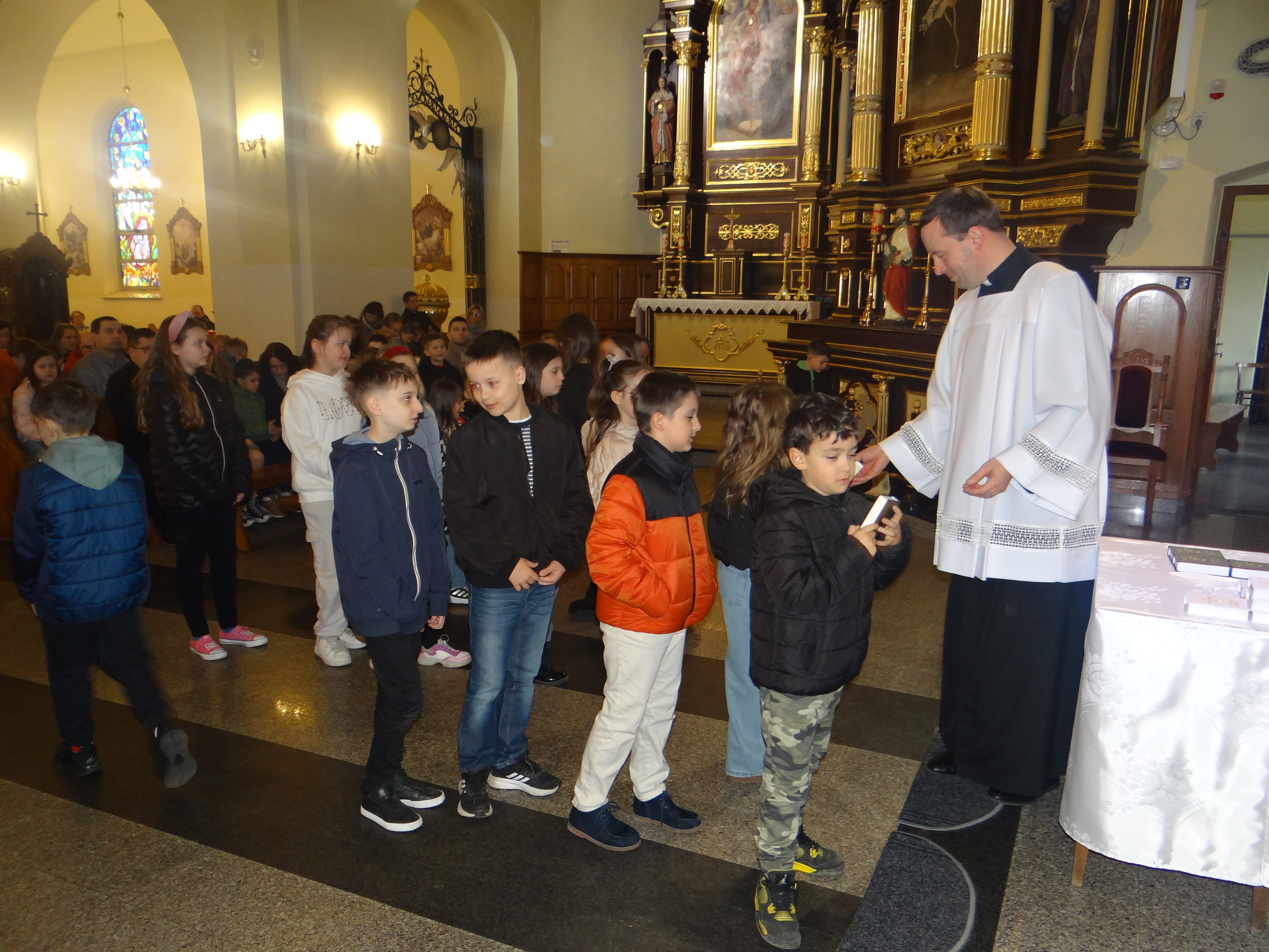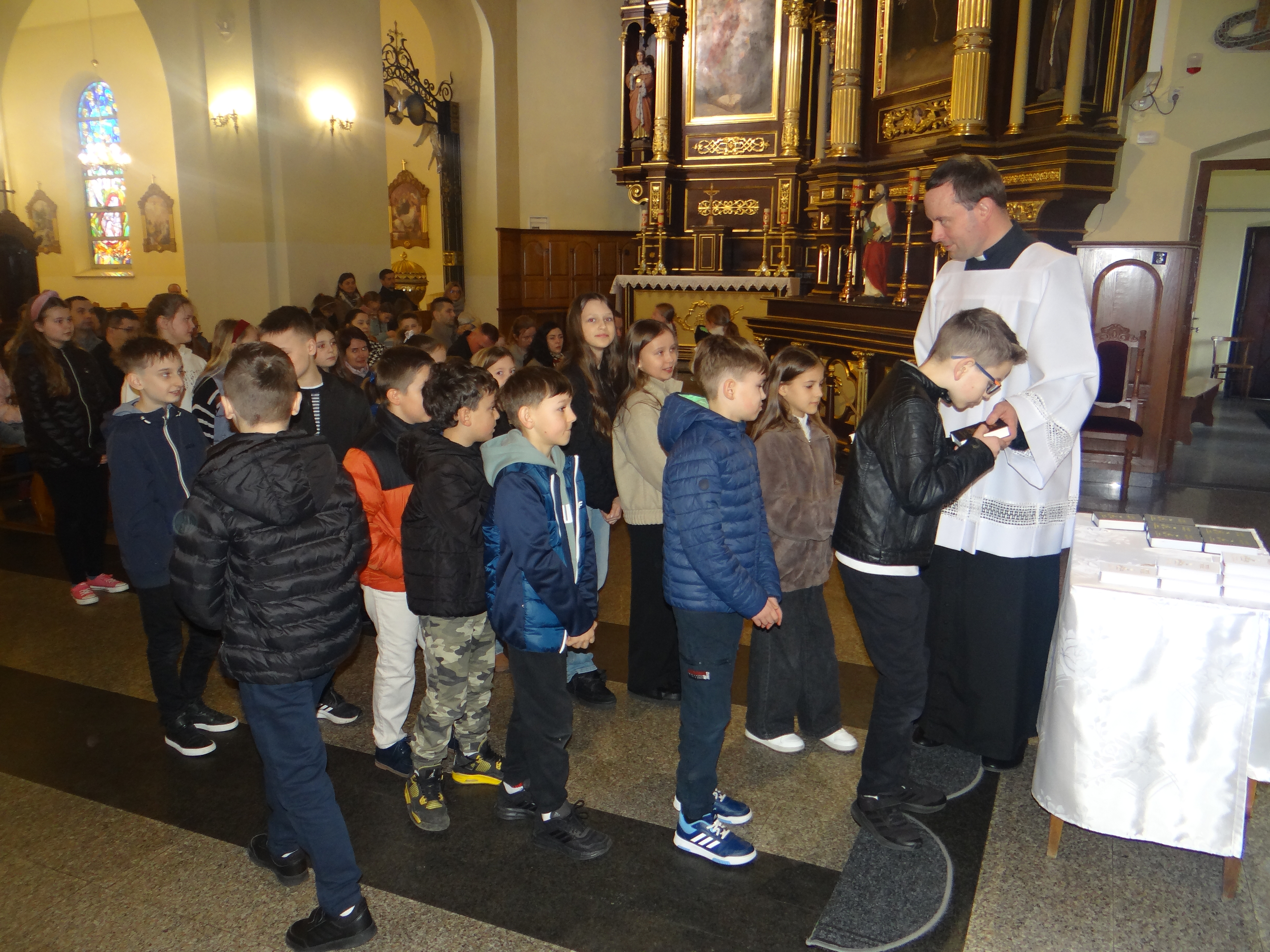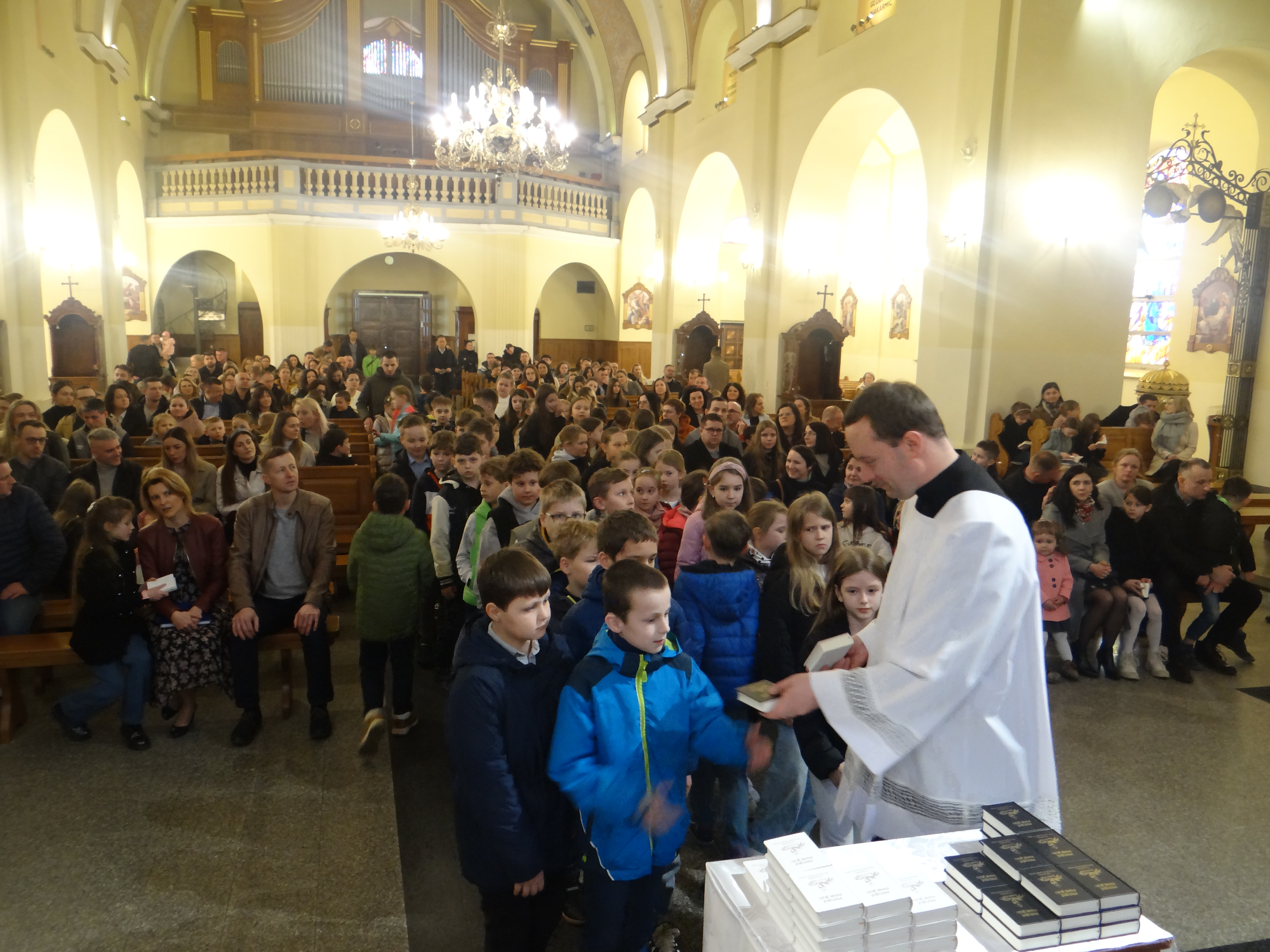 W dniu dzisiejszym w naszym kościele, podczas Mszy Świętej dla dzieci o godz. 11:00, zostały poświęcone modlitewniki uczniom klas trzecich szkoły podstawowej, którzy przygotowują się do przyjęcia I Komunii Świętej. Po zakończonej Eucharystii modlitewniki wręczył dzieciom ks. Karol Hadam, odpowiedzialny za ich przygotowanie do przyjęcia tego sakramentu. Był to ważny moment na drodze duchowego przygotowania najmłodszych do pełnego uczestnictwa w życiu eucharystycznym Kościoła. Po Mszy Świętej odbyło się także spotkanie organizacyjne z rodzicami, podczas którego poruszono kilka kwestii związanych bezpośrednio ze zbliżającą się uroczystością Pierwszej Komunii Świętej. Omówiono również sprawy dotyczące planowanej wycieczki dziękczynnej, która będzie formą podziękowania Panu Bogu za dar przeżytego sakramentu.