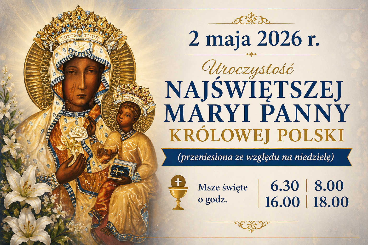Z radością i serdecznym zaproszeniem kierujemy do Was słowa zachęty do wspólnego przeżywania uroczystości Najświętszej Maryi Panny Królowej Polski – naszej szczególnej Patronki i Orędowniczki. To wyjątkowy dzień, w którym Kościół w Polsce w sposób szczególny oddaje cześć Maryi, zawierzając Jej nasze rodziny, parafię i całą Ojczyznę. Niech będzie to dla nas czas wdzięczności za Jej nieustanną opiekę oraz okazja do odnowienia naszej wiary i zaufania Bogu. Zapraszamy wszystkich Parafian do licznego udziału we Mszach Świętych, aby wspólnie modlić się o pokój, jedność i potrzebne łaski dla każdego z nas. Niech Maryja, nasza Królowa, prowadzi nas zawsze do swojego Syna.