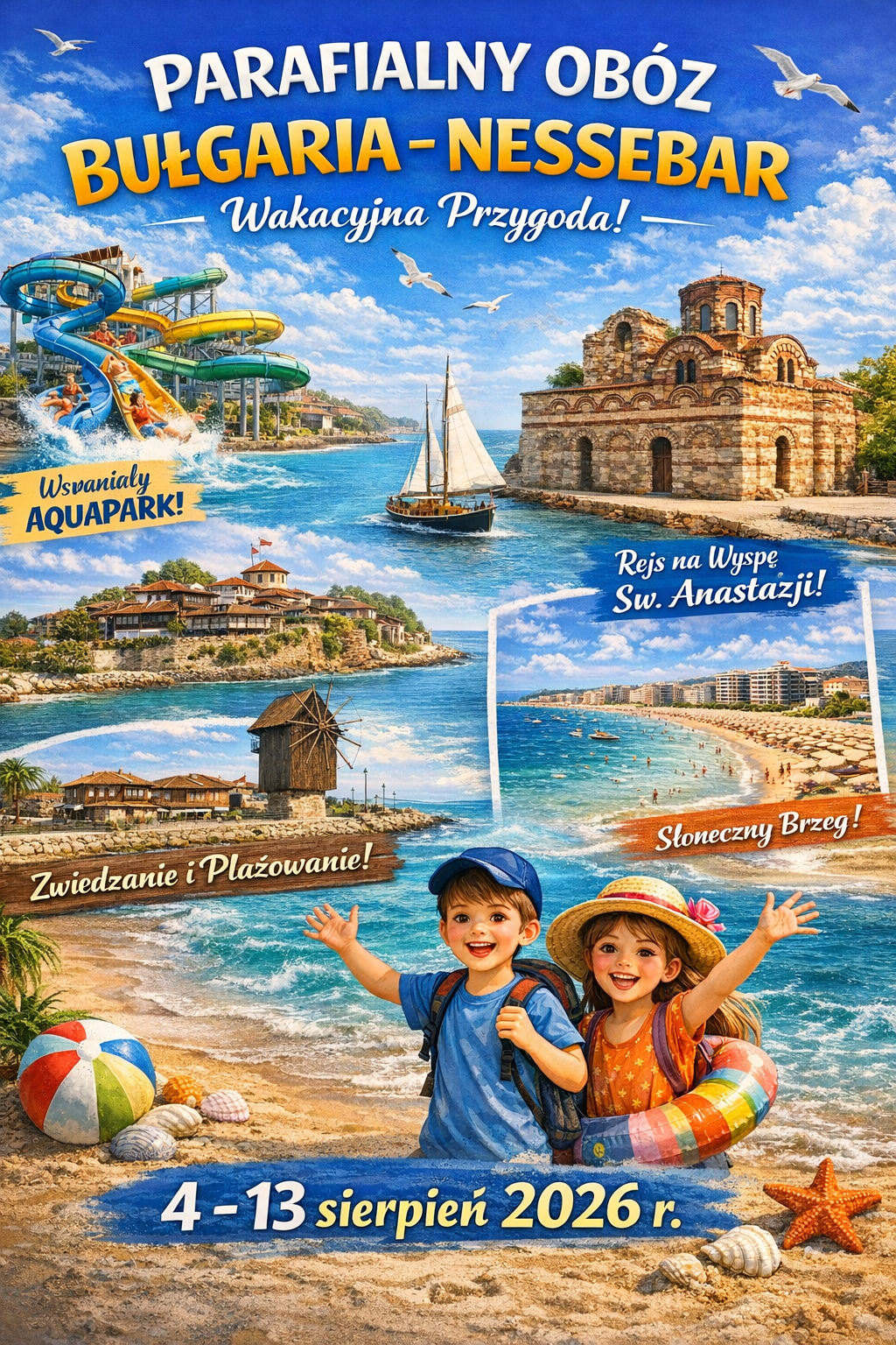 Serdecznie zapraszamy dzieci i młodzież na niezapomniany wakacyjny wyjazd parafialny do słonecznej Bułgarii! W dniach 4–13 sierpnia 2026 r. wyruszamy do malowniczego Nessebaru – miejsca, gdzie historia spotyka się z błękitem morza, a każdy dzień przynosi nową przygodę.