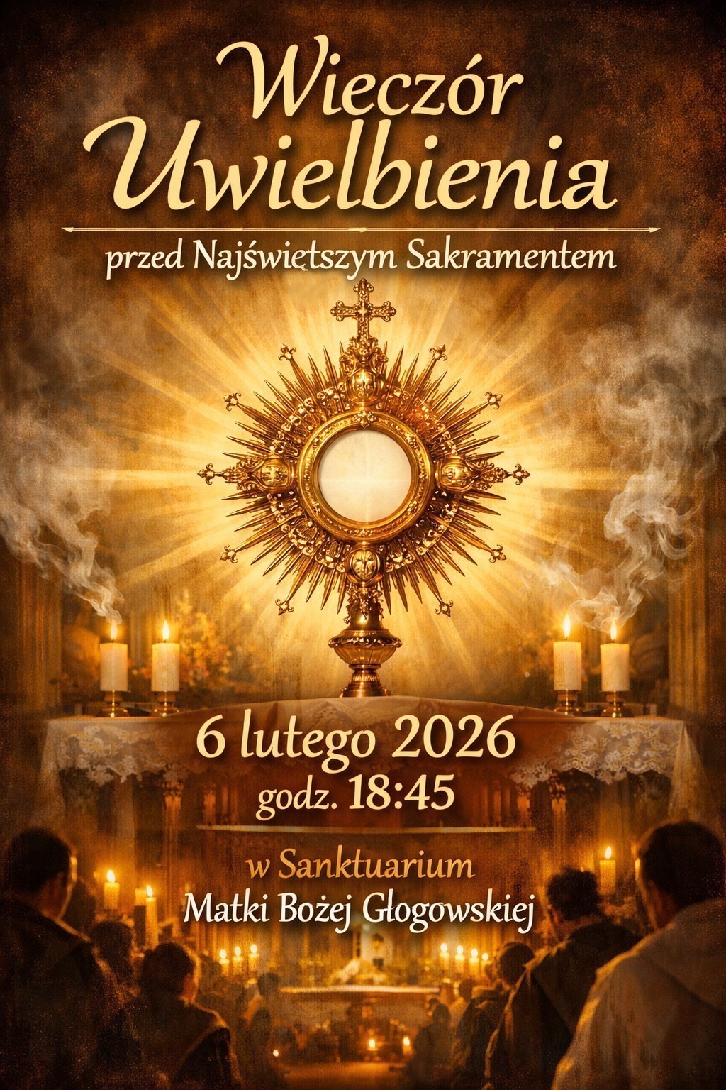 Z radością zapraszamy wszystkich Parafian na Wieczór Uwielbienia przed Najświętszym Sakramentem. To czas cichej modlitwy, pieśni uwielbienia i bycia blisko Jezusa obecnego w Eucharystii.